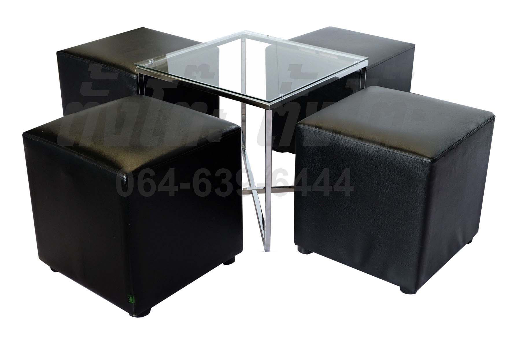 DS42 - เช่าชุดเก้าอี้สตูลลูกเต๋าสีดำ 4 ที่นั่ง พร้อมโต๊ะกลางกระจกใส